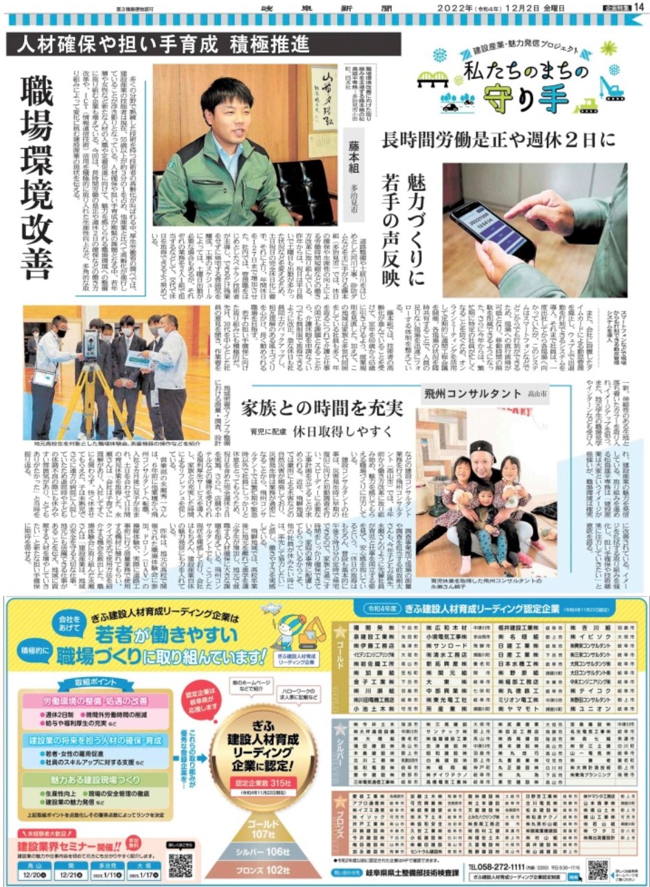 岐阜新聞にぎふ建設人材育成リーディング企業としての弊社の取り組みが掲載されました。