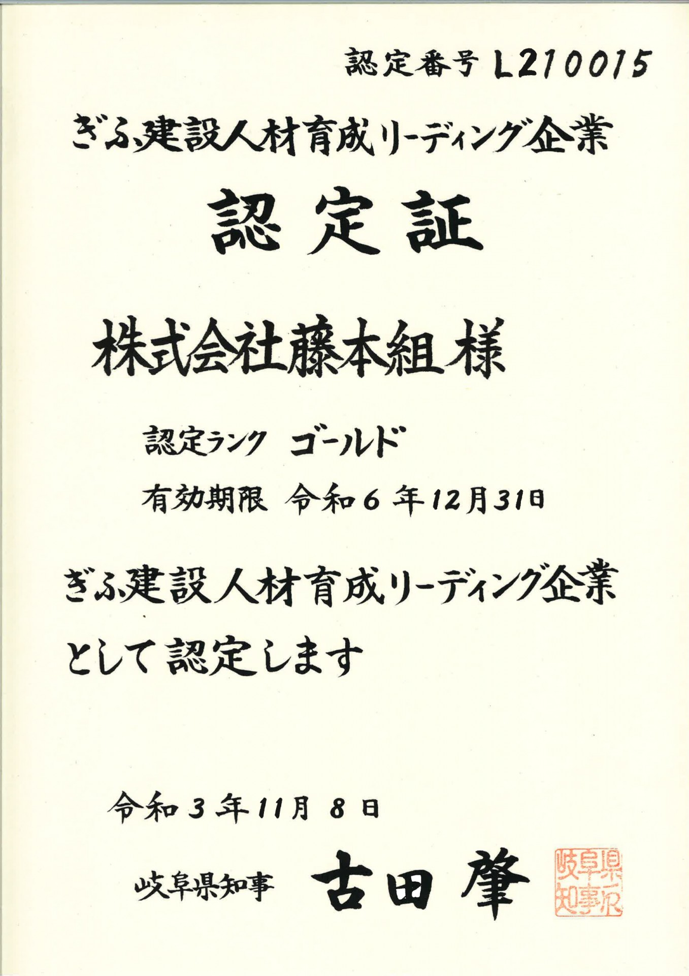 ぎふ建設人材育成リーディング企業 ゴールドランク認定
