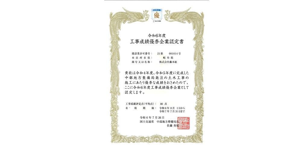 国土交通省 中部地方整備局⾧より 令和6年度工事成績優秀企業として認定していただきました。
